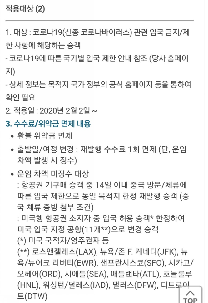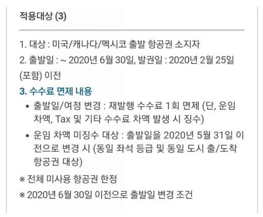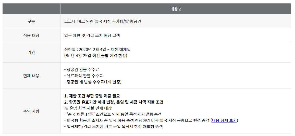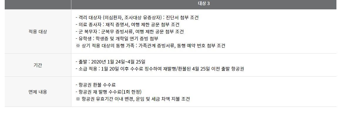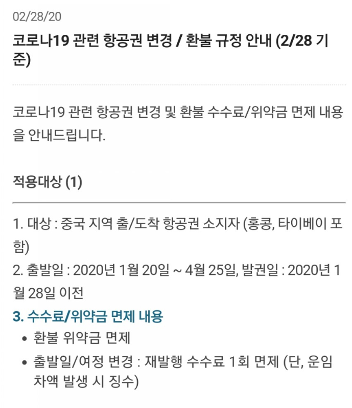 먼저 대한항공에서 코로나19 관련 항공권 변경 및 환불 수수료 및 위약금 면제 내용이 안내되었습니다. 아래 적용대상이신지 확인해주시기 바랍니다.