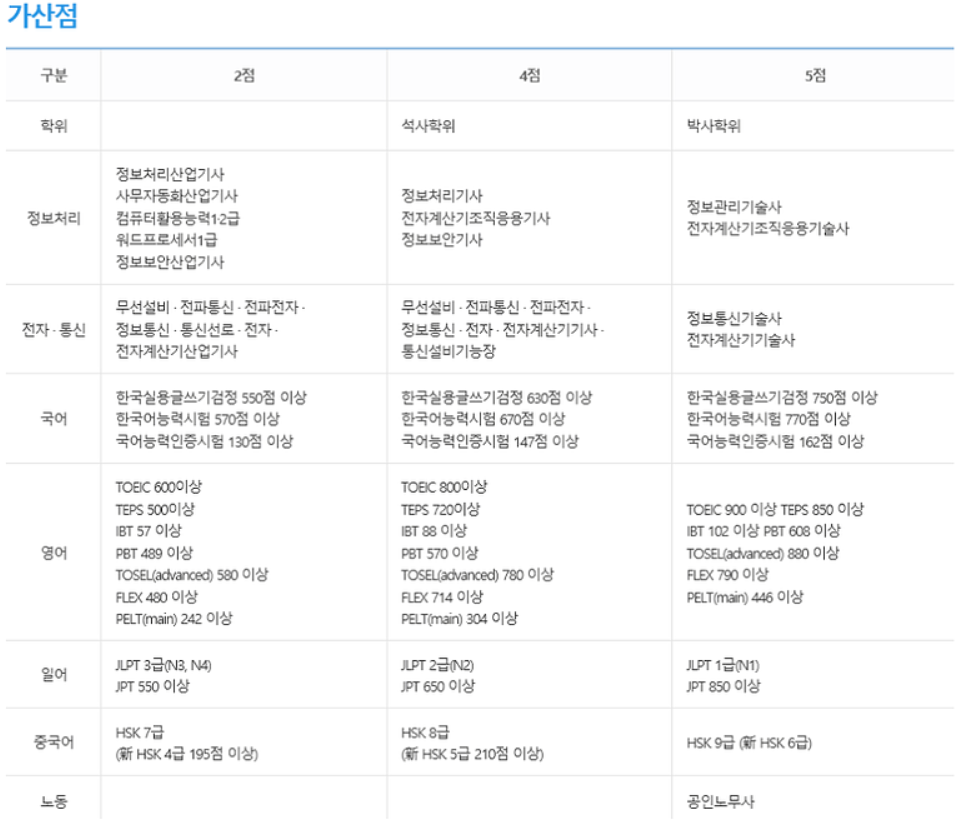 2점은 아래처럼 산업기사, 토익 600 이상, 일본어 중국어 등이 있고, 4점은 이들보다 높은 점수, 5점은 더 높은 점수를 이야기합니다.