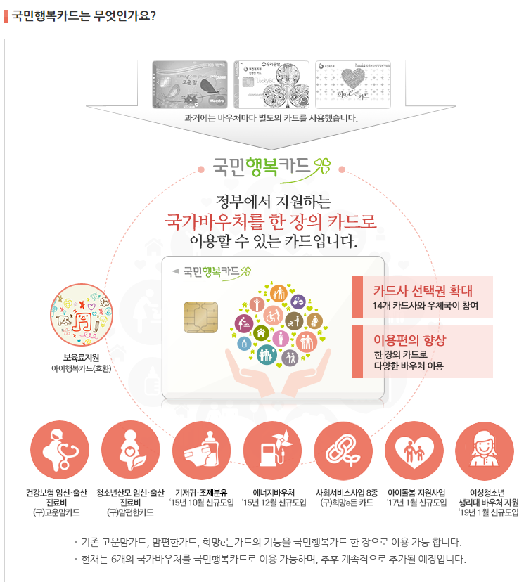 국민행복카드 사용방법을 알아보기 전에 카드에 대해 소개하겠습니다. 임신 출산진료비, 기저귀 조제분유, 에너지바우처, 사회서비스사업 8종, 아이돌봄 지원사업, 여성청소년 생리대 바우처 등을 지원하고 있습니다. 기존의 고운맘카드, 맘편한카드, 희망e든카드의 기능을 국민행복카드 한 장으로 이용 가능합니다.