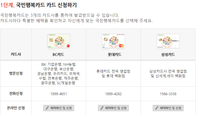 1단계로 국민행복카드 실물카드를 발급받습니다.