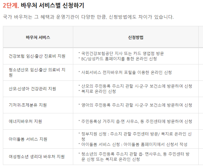 2단계로 바우처 서비스별 신청을 해주면 됩니다. 국가 바우처는 그 혜택과 운영기관이 다양한 만큼, 신청방법에도 차이가 있습니다.