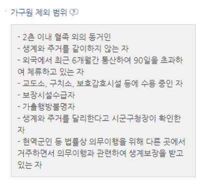 가구원 같은 경우는 등본상의 가족수를 말하고 가구원 제외 범위는 아래와 같습니다.