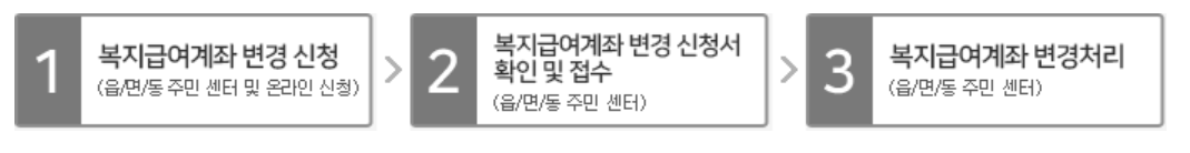 필요 서류는 방문시 복지급여계좌변경 신청서, 신청자 신분증서, 통장사본입니다.