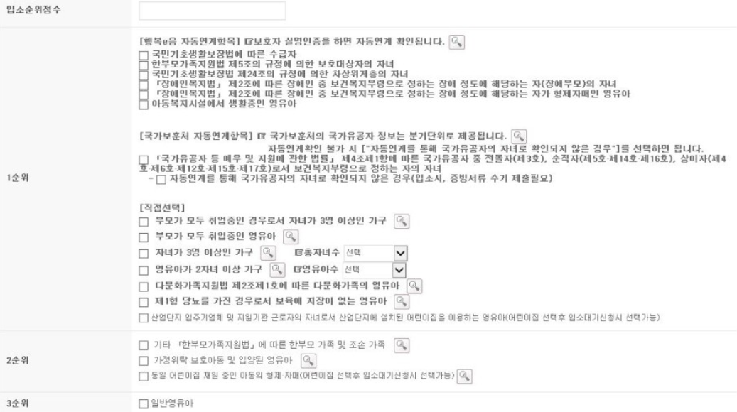 그러면 가입한 뒤 입소순위점수를 부여받게 됩니다. 1,2,3순위로 항목당 100점/50점이 되는데 맞벌이이면서 자녀가 3명 이상이면 점수가 높습니다.