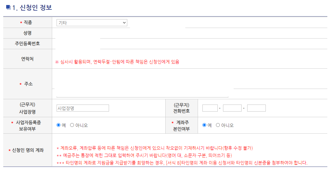 위 내용을 읽어보신 뒤 신청인 정보로 갑니다. 다만 준비물이 좀 많습니다.
