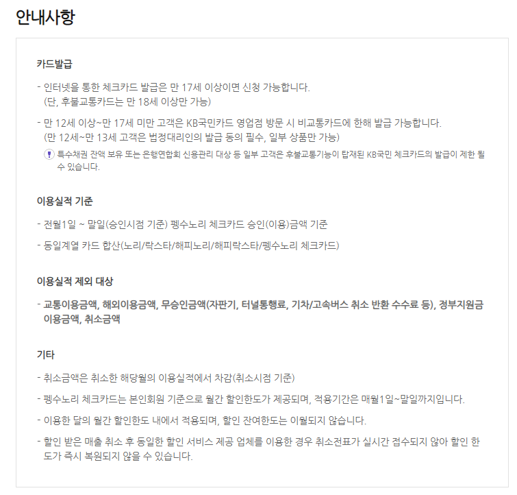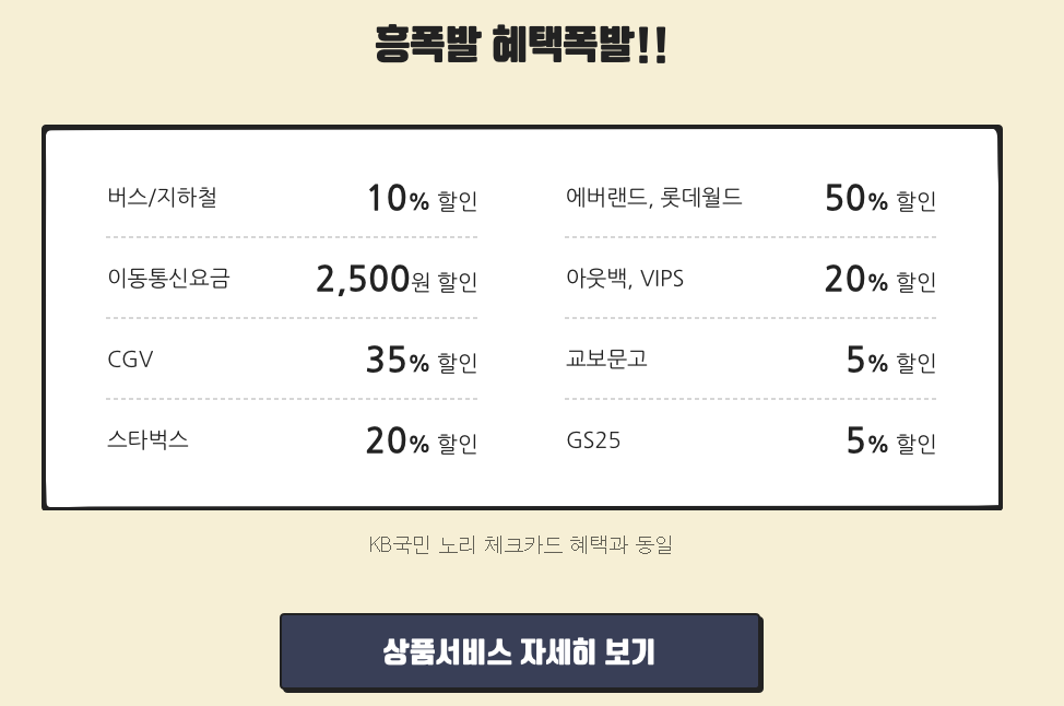 이 카드의 혜택은 다음과 같이 KB국민 노리 체크카드 혜택과 동일한데요.