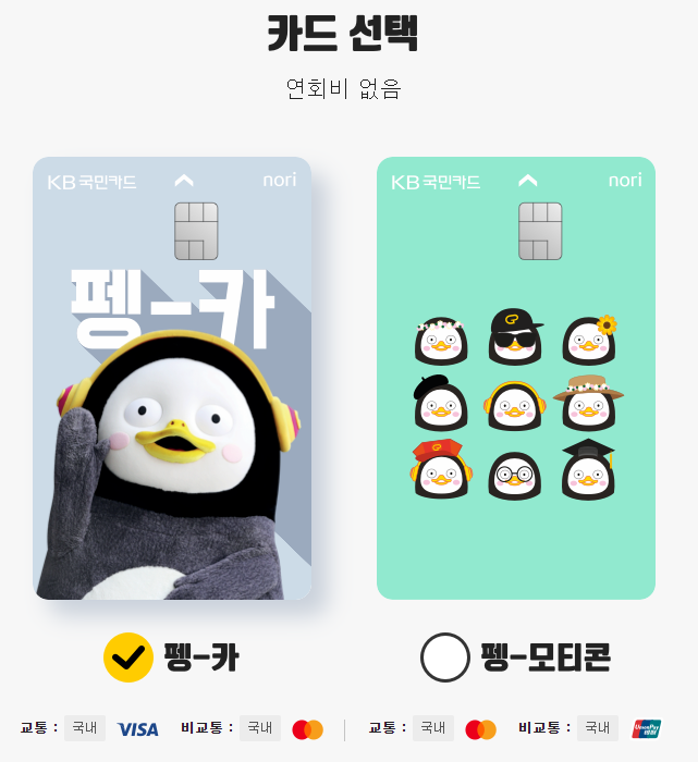 이 두 카드는 용도가 좀 다른데요, 왼쪽의 카드는 교통: 국내 비자, 비 교통: 국내 마스터 카드이며, 오른쪽 카드는 교통: 국내 마스터 카드, 비교통: 국내 유니온 페이입니다.